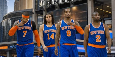 Carmelo Anthony, Jeremy Lin y Landry Fields sentados en el banquillo del Madison Square Garden.